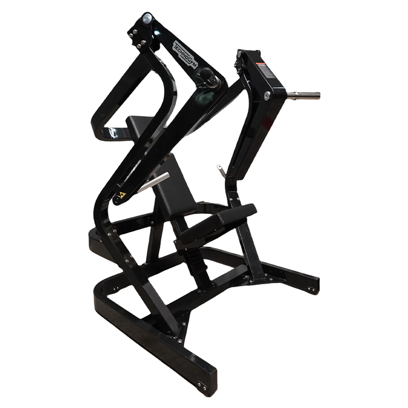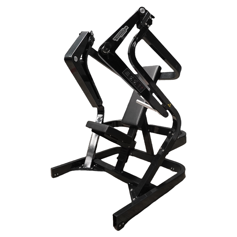 El Press Declinado Black Series se enfoca en el desarrollo de la porción inferior del pectoral. Su biomecánica presenta una trayectoria de movimiento convergente y brazos independientes (iso-laterales). Este diseño asegura una contracción muscular máxima y una mayor seguridad articular, ideal para el entrenamiento de fuerza pesado en gimnasios.