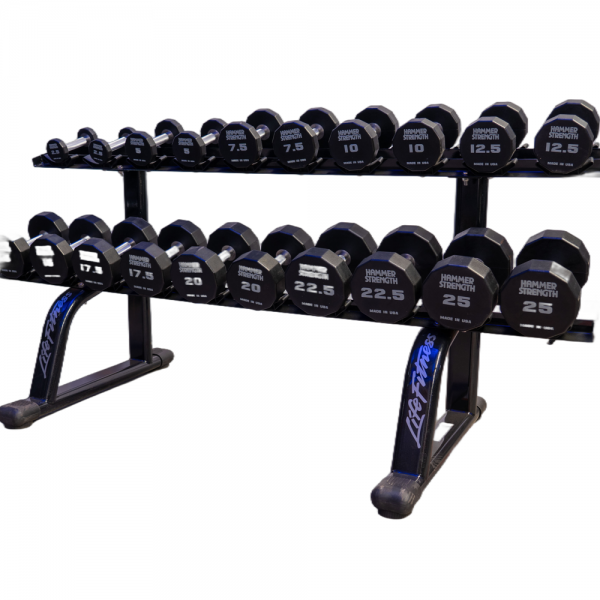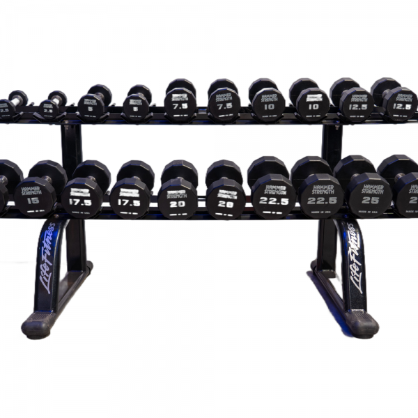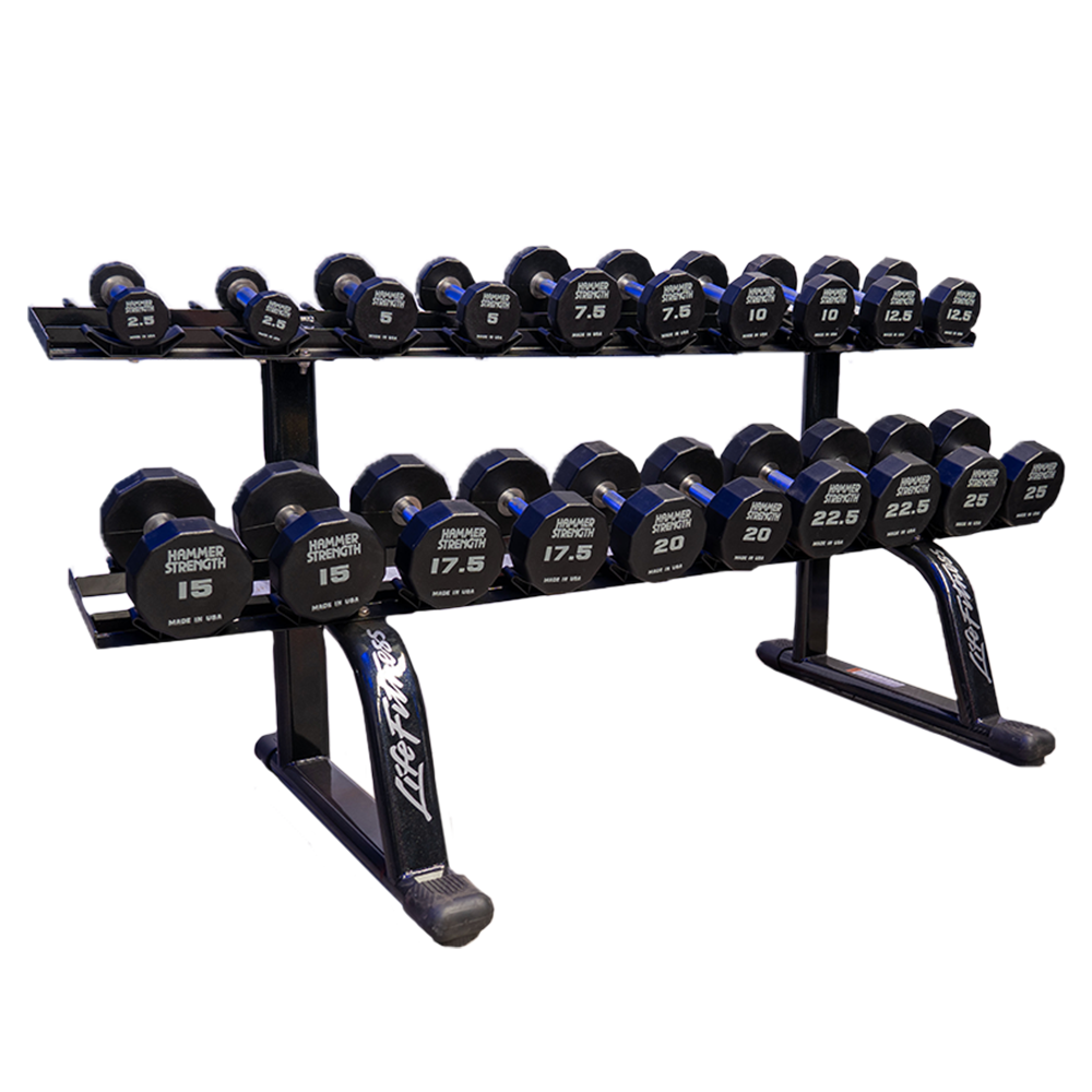 Las mancuernas Hammer Strength están fabricadas con goma duradera químicamente adherida, que garantiza resistencia al desgaste y amortigua impactos. Su sistema de bloqueo doble y sujeción firme ofrecen estabilidad y seguridad durante entrenamientos intensivos. Con un rango de peso de 2.5 k a 25 k en incrementos de 2.5 k, son ideales para gimnasios de alto tráfico y entrenamientos de fuerza variados.