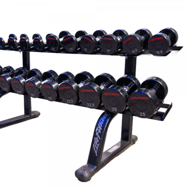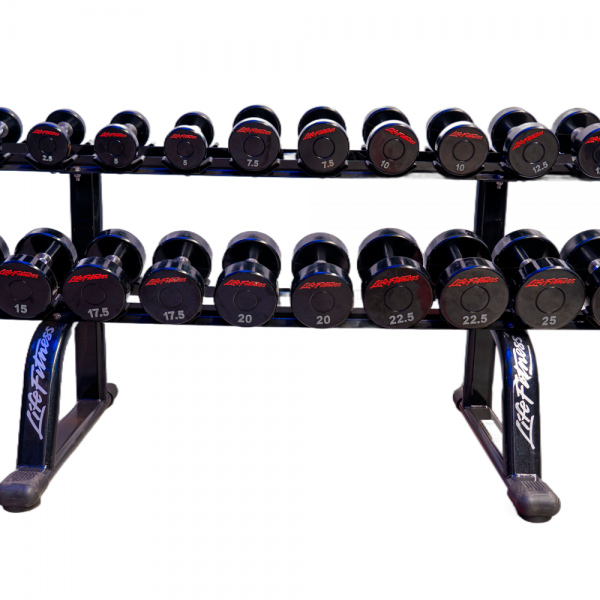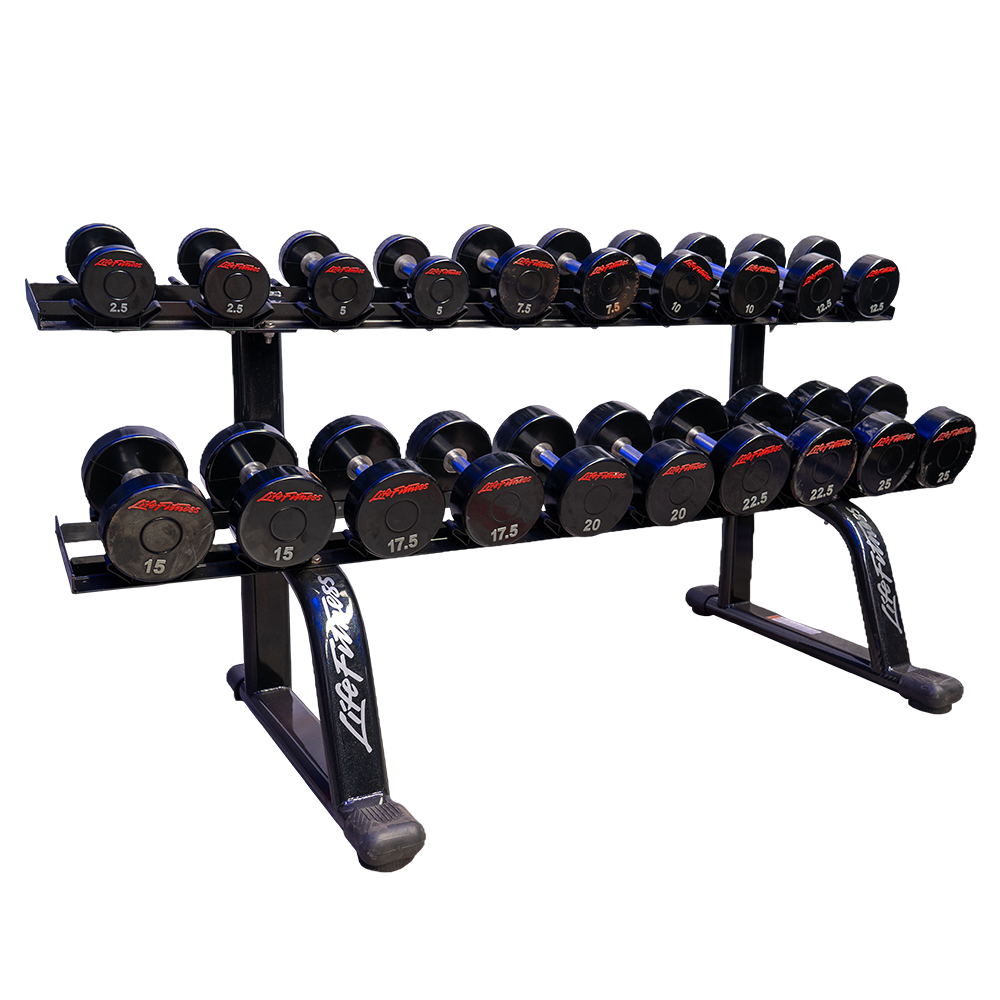 El set de Mancuernas Life Fitness brinda seguridad y rendimiento con mancuernas de poliuretano resistente a impactos y diseño moderno. Su mango anatómico cromado texturizado asegura un agarre firme, optimizando la biomecánica del ejercicio. Son ideales para entrenamientos intensivos en gimnasios de uso rudo. Incluye 10 pares de 2.5 k a 25 k, con incrementos de 2.5 k.