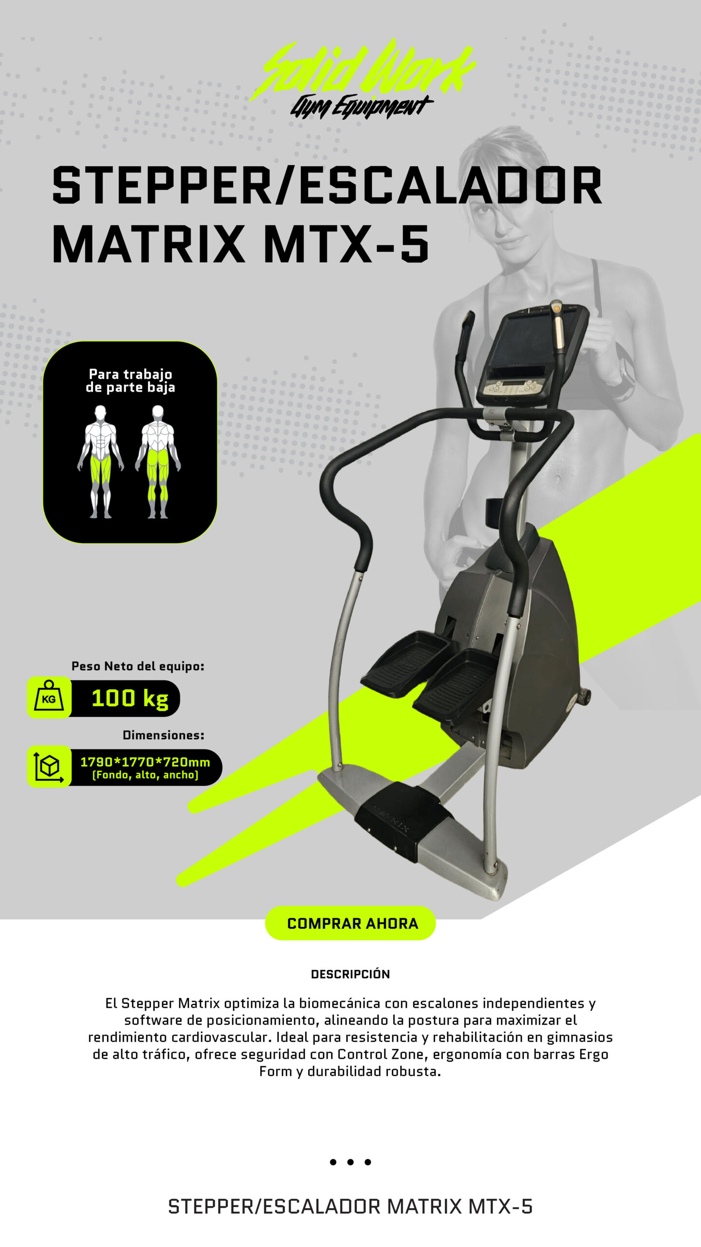 EL Stepper Matrix optimiza la biomecánica con escalones independientes y software de posicionamiento, alineando la postura para maximizar el rendimiento cardiovascular. Ideal para resistencia y rehabilitación en gimnasios de alto tráfico, ofrece seguridad con Control Zone, ergonomía con barras Ergo Form y durabilidad robusta.